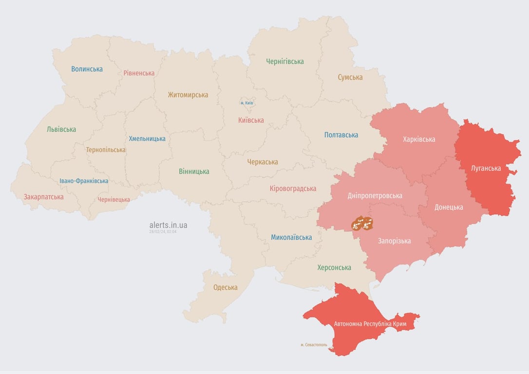 Воздушная тревога в среду, 28 февраля, прозвучала в ряде областей Украины. Она была введена в 02:05 в связи с угрозой применения баллистического вооружения со стороны РФ.