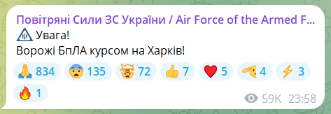 Воздушные силы отмечают, что вражеские "шахеды" приближаются к Харькову.