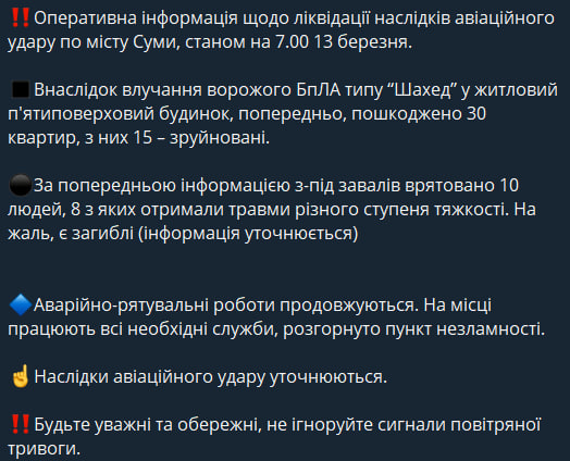 Российские оккупанты ночью, 13 марта, ударили беспилотником типа Shahed по жилому пятиэтажному дому в Сумах. Из-под завалов спасены десять человек.